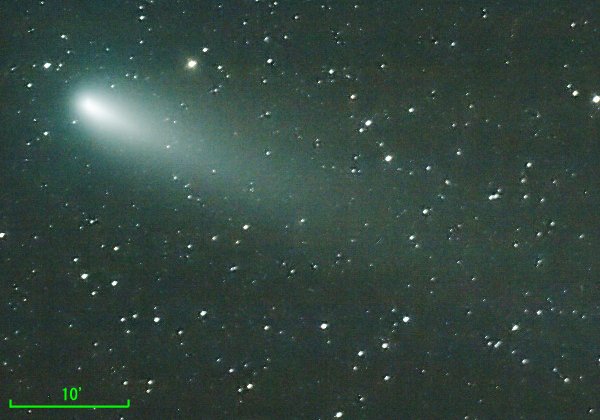 シュワスマン・ワハマン第3彗星-B核(C0073P-B) 撮影日時 : 2006年5月1日 02時40分〜02時48分 望遠鏡 : 口径200mm 焦点距離800mm(F4)直焦点 カメラ : Canonの一眼レフデジカメ EOS 10D フィルタ : なし 露出時間 : 90秒 2画像コンポジット(加算) 撮影条件 : 感度 ISO 1600相当、 ホワイトバランス:太陽光 画像サイズ : 3072x2048pixelsから1/3サイズ ソフトビニング&トリミング 撮影場所 : 天城山駐車場 備考 : |