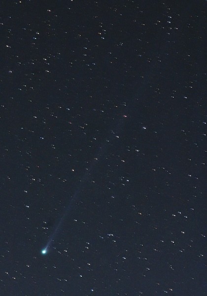 撮影日時 : 2006年3月5日 04時52分〜05時15分 カメラ : Canonの一眼レフデジカメ EOS 10D レンズ : Canon EF200mm F2.8 絞りF11 露出時間 : 6分 x 3画像をコンポジット 撮影条件 : 感度 ISO 800相当、ホワイトバランス:太陽光 画像サイズ : 3072x2048pixelsから1/3リサイズ&トリミング 撮影場所 : 伊豆の天城山の登山者駐車場 備考 : 約4゜の長さの尾が写っています。 |