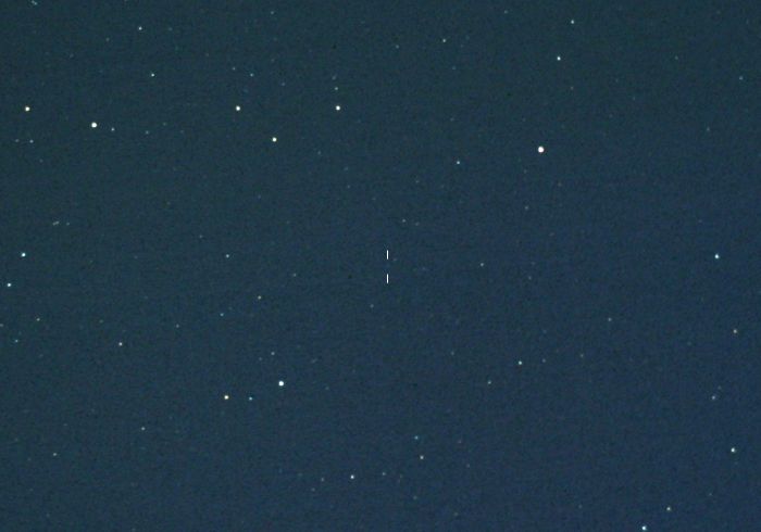 | 冥王星 撮影日時 : 2004年6月22日 22時54分〜57分 望遠鏡 : Vixen R200SS 口径200mm 焦点距離800mm(F4) カメラ : Canonの一眼レフデジカメ EOS 10D フィルタ : TOKAI NRF-Jフィルタ使用 露出時間 : 30秒 x 5画像コンポジット 撮影条件 : 感度 ISO 1600相当、ホワイトバランス:太陽光 画像サイズ : 3072x2048pixelsから1/2リサイズ&トリミング(画像の画角は約45'x30'です。) 撮影場所 : 横浜市金沢区富岡の自宅ベランダ 備考 : 中央の2本の縦線の間の星が冥王星と思われます。 |