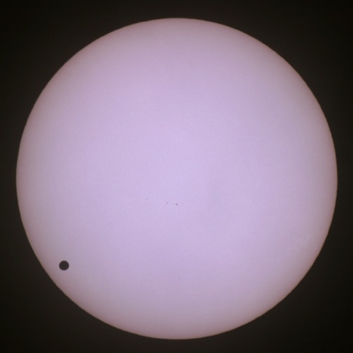| 金星日面通過 撮影日時 : 2004年6月8日 14時58分02秒 望遠鏡 : Vixen R200SS 口径200mm F4、1500mm Extender(F7.5) ASTRO SOLARフイルター(ND-5) にて減光 カメラ : Canonの一眼レフデジカメ EOS 10D 露出時間 : 1/350秒 撮影条件 : 感度 ISO 100相当、ホワイトバランス:太陽光 画像サイズ : 3072x2048pixelsからリサイズ&トリミング 撮影場所 : 横浜の自宅 |