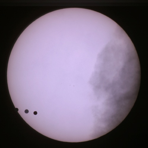 金星日面通過(合成画像) 撮影日時 : 2004年6月8日 14:20:20、14:58:02、15:31:04 望遠鏡 : Vixen R200SS 口径200mm F4、1500mm Extender(F7.5) ASTRO SOLARフイルター(ND-5) にて減光 カメラ : Canonの一眼レフデジカメ EOS 10D 露出時間 : 1/350秒 撮影条件 : 感度 ISO 100相当、ホワイトバランス:太陽光 画像サイズ : 3072x2048pixelsからリサイズ&トリミング 撮影場所 : 横浜の自宅 |