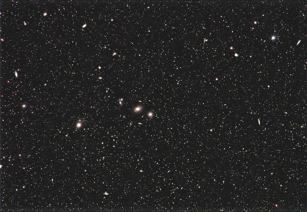 | 撮影日時 : 2013年01月13日03時09分〜05時32分 カメラ : Canon EOS kissX2(改造) レンズ : EF200mm f/2.8L USM 絞りF4.0 フィルタ : LPS-P2 露出時間 : 6分 x 14コマ 撮影条件 : 感度 ISO 1600、RAW 画像処理 : PS CS5でRAW現像、SI6でコンポジット、フラット補正、レベル調整&トーンカーブ補正 画像サイズ : 4272x2848pixelsを1/4リサイズ&トリミング 撮影場所 : 三崎町 六合 岩堂山裏 備考 : メシエ銀河が8個、NGC銀河が25個以上写っています。12等級より明るい銀河の番号を記載した画像を下に載せます。 また「マルカリアンチェーン」を青い線で示しました。 |