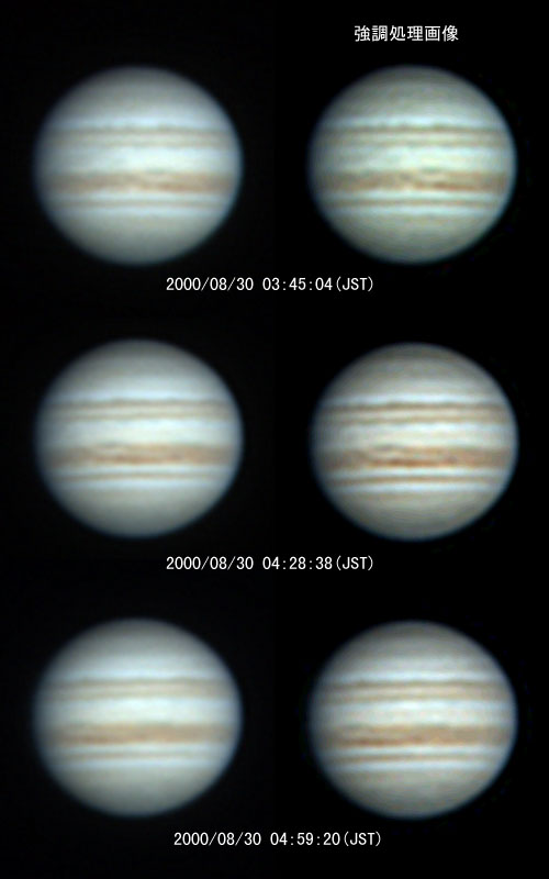 | 画像処理 | PICONAのRAW画像(JPEG画像への変換前の10bit画像)を、 月惑研究会関西支部の池村氏考案のソフトでBMP画像に変換 し、コンポジット及びアンシャープ処理を実施。 強調処理画像は、Lunar and Planetary Photo Galleryの 池本氏から頂いた画像処理ソフトAIMでウイナーフィルター 処理を施したものです。 |