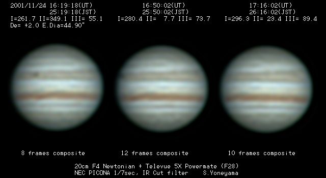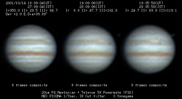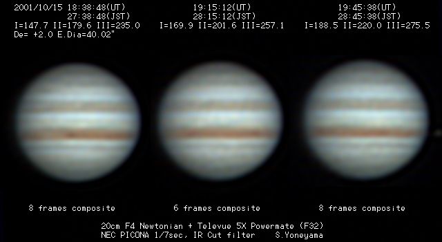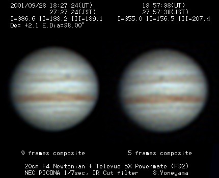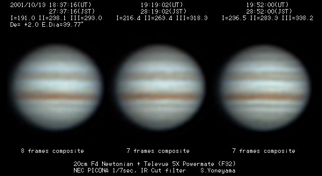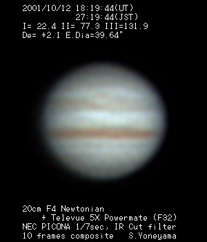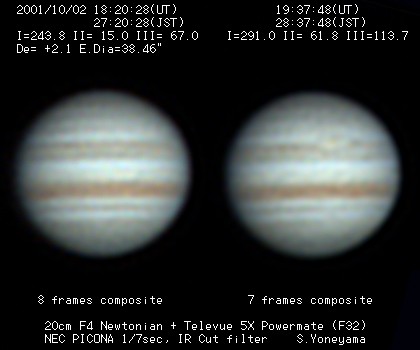 | 画像処理 | PICONAのRAW画像(JPEG画像への変換前の10bit画像)を、 月惑研究会関西支部の池村氏考案のソフトでBMP画像に変換 し、コンポジット及びアンシャープ処理を実施。 強調処理画像は、Lunar and Planetary Photo Galleryの 池本氏から頂いた画像処理ソフトAIMでウイナーフィルター 処理を施したものです。 |