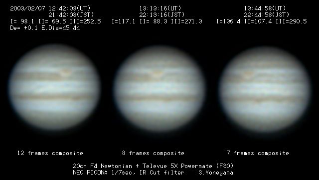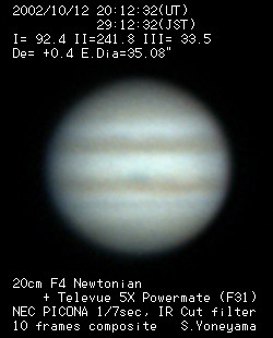 | 画像処理 | PICONAのRAW画像(JPEG画像への変換前の10bit画像)を、 月惑研究会関西支部の池村氏考案のソフトでBMP画像に変換 し、コンポジット及びアンシャープ処理を実施。 強調処理画像は、Lunar and Planetary Photo Galleryの 池本氏から頂いた画像処理ソフトAIMでウイナーフィルター 処理を施したものです。 |