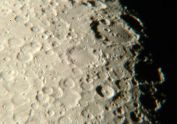 月面南部の火口(月令9) 1.撮影日時 : 2003年01月12日 18時28分 2.望遠鏡 : 口径200mm x 焦点距離 800mm+10mm接眼レンズ 合成焦点距離 6,800mm 合成F値 34 3.カメラ : 一眼レフデジカメ FujiFilm S2Pro 4.露出時間 : 1/20秒 ISO800 5.撮影場所 : 自宅のベランダ 6.画像処理 : 2,304x1,536ピクセルの画像を1/2リサイズ後トリミング