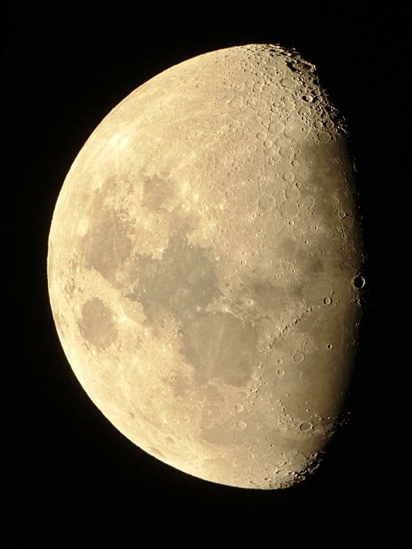 月(月齢8.7) 1.撮影日時 : 2003年09月05日 19時58分 2.望遠鏡 : 口径200mm x 焦点距離 800mm+エクステンダー 合成焦点距離 1,500mm 合成F値 7.5 3.カメラ : 一眼レフデジカメ FujiFilm S2Pro 4.露出時間 : 1/90秒 ISO400 5.撮影場所 : 自宅のベランダ 6.画像処理 : 4256x2848ピクセルの画像を1/4サイズにソフトビニング後 トリミング、レベル調整&アンシャープマスク処理
