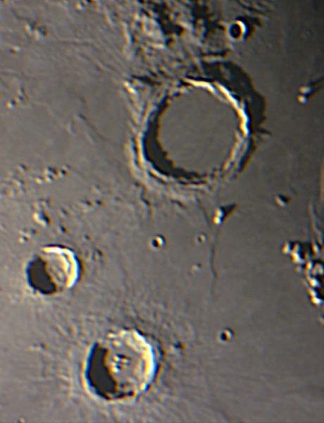 1.撮影日時 : 2009年06月01日 20時46分 2.望遠鏡 : 口径200mm x 焦点距離1200mm x 2.8倍バロー 合成焦点距離4000mm 合成F20 3.カメラ : DFK21AF04 4.撮影条件 : 15fps、1/15秒、60秒、ゲイン770、 600フレームスタック 5.撮影場所 : 自宅のベランダ 6.画像処理 : Registaxにてスタック&ウェーブレット処理 7.備考 : 上部の大きなクレータがアルキメデス、 下部の中位のクレータがアリステュッロス、 左下の小さ目のクレータがアウトリュコスです |