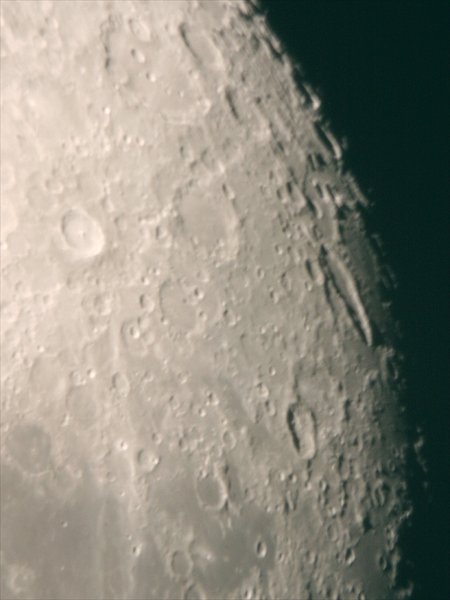 | 月面(月齢10.9)南部−ティコ〜シラー 撮影日時 : 2004年11月23日 21時12分 望遠鏡 : Vixen R200SS D200mm F4、Televue 5X Powermate F28 カメラ : Canonの一眼レフデジカメ EOS 10D 露出時間 : 1/20秒 撮影条件 : 感度 ISO 400相当、ホワイトバランス:太陽 画像サイズ : 3072x2048pixelsをリサイズ&トリミング 撮影場所 : 自宅のベランダ 備考 : 縦長のクレータがシラーで、左側の明るいクレータが ティコです。 |