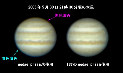 | 光を通す物は、光の波長に応じた屈折率があり、その屈折率の違いで 現れるのが虹です。大気にも僅かな屈折率があり、大気が厚くなる低空 では、それが顕著に表れます。 その影響で低空の星や惑星を高倍率の望遠鏡で眺めると、虹の様に色が 滲んで見えます。どんなに拡大しても点像の恒星では、ほとんど気に なりませんが、面として見える惑星では、虹の様な色滲みが激しく なります。その様な現象を色の大気分散と呼んでいます。 高度が低い時の惑星は、特に色の大気分散が顕著です。 その様な色滲みを防ぐにはプリズムを使って色の大気分散と逆向きの 色分散をかければ良いのです。その様な逆向きの色分散用に使用して いるのがWedgePrism(ウェッジプリズム)です。 角度が1度から数度と僅かな傾きを持ったプリズムと思って頂ければ 良いでしょう。 右の画像が、オプトマックス社製の1度、2度、4度のWedgePrismです。 2枚組み合わせれば、1度〜6度までの調整が可能です。 同社では、安価なBK7ウェッジと高級な溶融石英ウェッジの2種類が ありますが、安価なBK7ウェッジを購入しました。 なお、同社では、透過率低下を防ぐコーティングも可能ですが、 価格は10倍程度になるそうです。 2番目の画像は、WedgePrismを31.7mmのアメリカンサイズの フィルタ枠に入れた物と、それをToUcamにセットした状態です。 3番目の画像は、WedgePrism(ウェッジプリズム)を使わない場合と 使った場合の木星の比較画像です。 WedgePrism(ウェッジプリズム)未使用の左側の木星画像では、 木星の左下に青色滲みが、その反対の右上に赤色滲みが出ています。 |