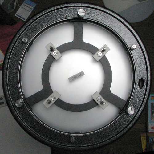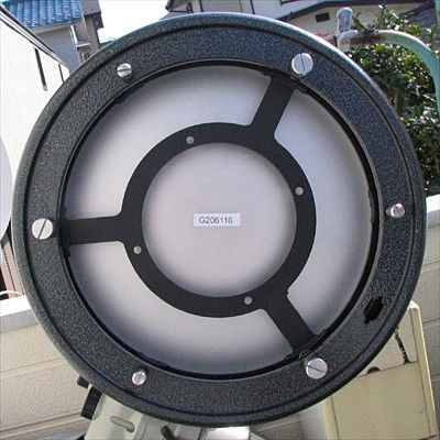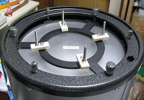笠井トレーディングの口径200mmF6のニュートン反射望遠鏡 GINJI200Nの主鏡は、シースルーです。その主鏡金具には、 4個の5mmの穴が開いています。 |
