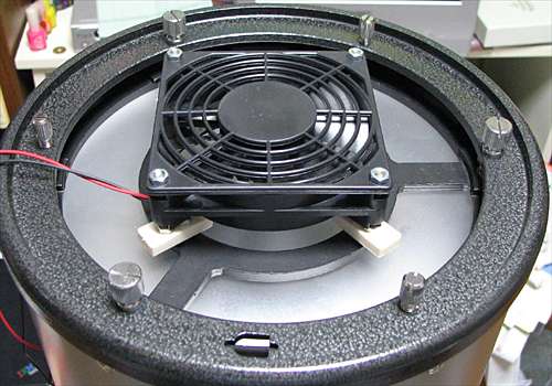 | 反射望遠鏡の主鏡のガラスは、鏡筒の金属より熱伝導率が低いので、昼間温まった熱が冷め難い性質があります。 気温が下がる夜になると早く冷える鏡筒と温度差が生まれ、暖かい主鏡から僅かですが湯気の様な気流が立ち昇ります。 この気流が鏡筒内気流で、惑星像の乱れの原因の一つになるのです。 主鏡に強制的に風を送って主鏡を早く冷やすことで、鏡筒内気流の減少が望めるので、冷却ファンをつけることにしました。 |
