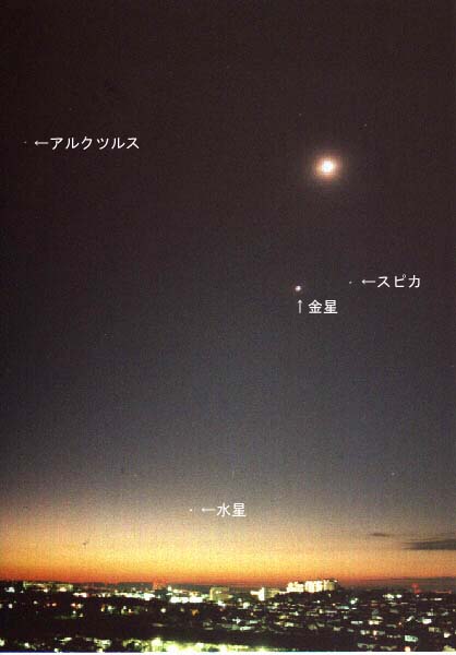 | 月・金星・水星(画像をクリックすると星名の説明図が表示されます) 1.撮影日時 : 1999年12月3日 05時30分 2.カメラ : MINOLTA SRT101 f28mm F2.8 開放 3.フイルム : フジフイルム Super G Ace 400 4.露出時間 : 10秒 5.撮影場所 : 横浜富岡西光ヶ丘公園 |