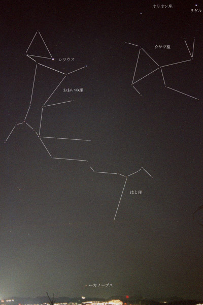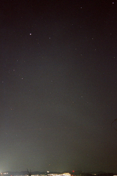 | 1.撮影日時 : 2000年2月9日 20時48分 2.カメラ : MINOLTA SRT101 f28mm F2.8 開放 3.フイルム : フジフイルム SUPER 400 4.露出時間 : 30秒 5.撮影場所 : 能見台の見晴台 |