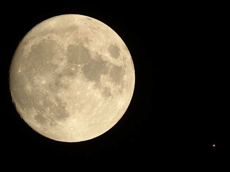 月(月齢12.8)と火星 1.撮影日時 : 2003年09月09日 22時06分 2.望遠鏡 : 口径200mm x 焦点距離 800mm F4 3.カメラ : 一眼レフデジカメ FujiFilm S2Pro 4.露出時間 : 1/1000秒 ISO400 5.撮影場所 : 自宅のベランダ 6.画像処理 : 4256x2848ピクセルの画像を1/3サイズにソフトビニング後 トリミング、レベル調整&アンシャープマスク処理