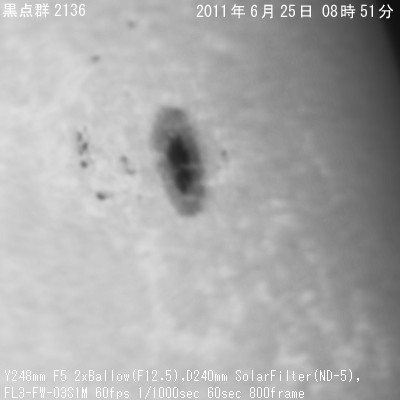 右側の画像 太陽黒点1236群、1240群、1241群の拡大画像 撮影日時 : 2011年06月25日 8時50分−08時55分 望遠鏡 : Y248mm F5 2xBallow F12.5 フィルタ : AstroZap Solar Filter(ND5) D240mm カメラ : FL3-FW-03S1M 撮影条件 : 116fps 1/1000sec 60sec 800frame stuck 撮影場所 : 自宅のベランダにて太陽 備 考 : |