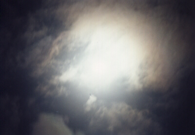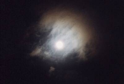 薄曇を通して見た満月です。月明かりに照らされた雲の模様が幻想的でした。 (自宅のベランダで撮影) 上の写真は、月が見える様に強く焼き付けた物で 下の写真は、雲の模様が良く解かるように淡く焼き付けた物です。
