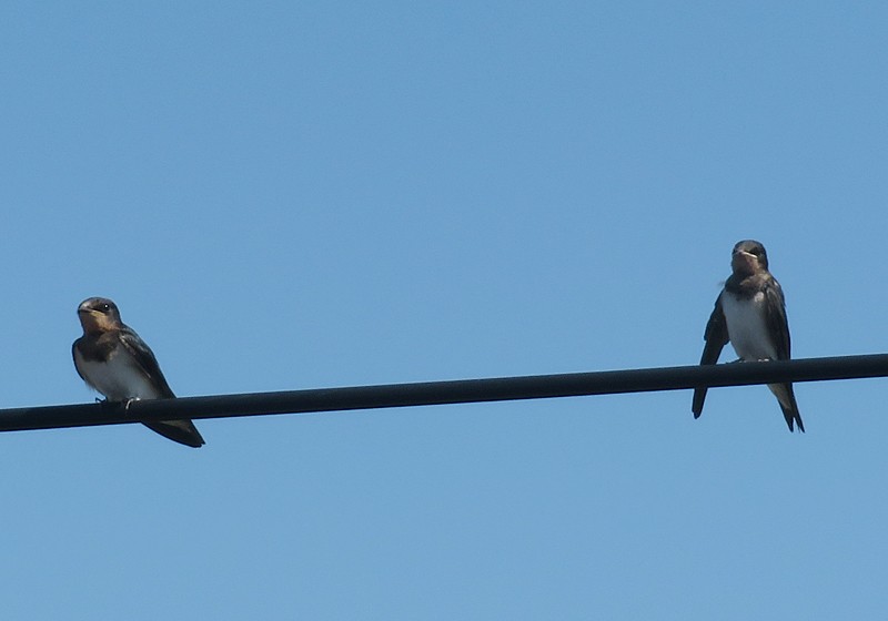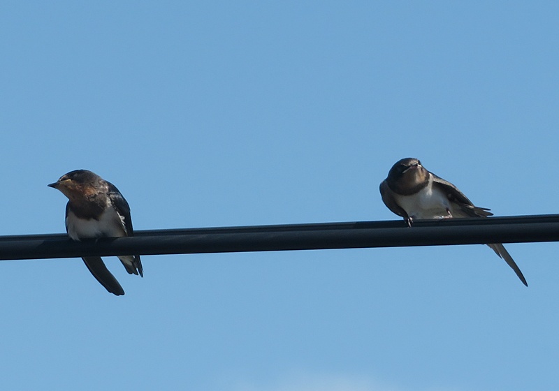 今日の画像は、ツバメの若鳥です。昨日の午前中に布団を干すため、屋上に上がったら屋上近くの電線に2羽のツバメが止まっていました。2羽とも身体が小さめだったので、この春に巣だった若鳥でしょう。まだ人への警戒心が弱いのか、3m程迄近付いて撮影出来ました。羽繕いの真っ最中で、しゃがんだり背伸びをして羽を掃除していました。