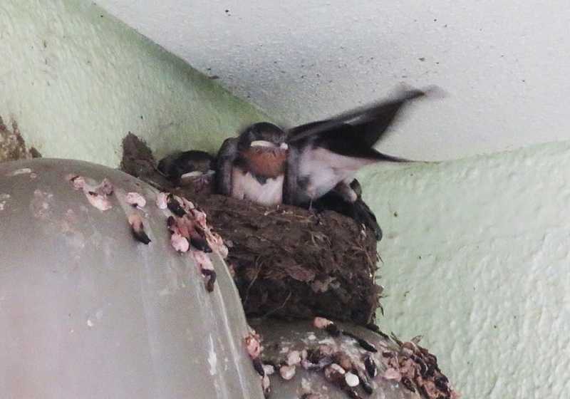 今日の画像は、ツバメの2度目の子育てです。1度目の子育てが早めに終わったのでしょう。ツバメの親は2度目の子育てで忙しそうです。画像は、親鳥が巣の掃除をしている所です。