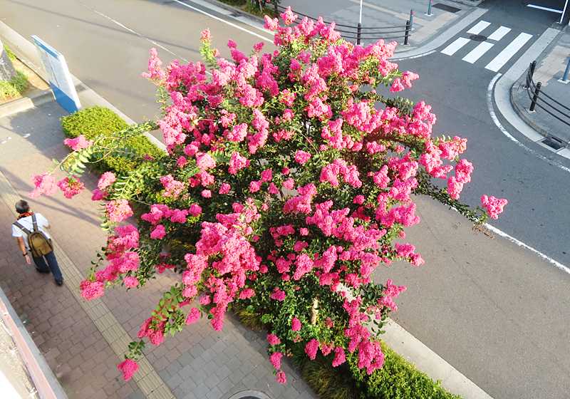 今日の画像は、真っ赤な百日紅です。鶴見駅東口のロータリの百日紅が例年通り、先月の中旬頃に咲き始め、赤みの強い花が目を引いています。