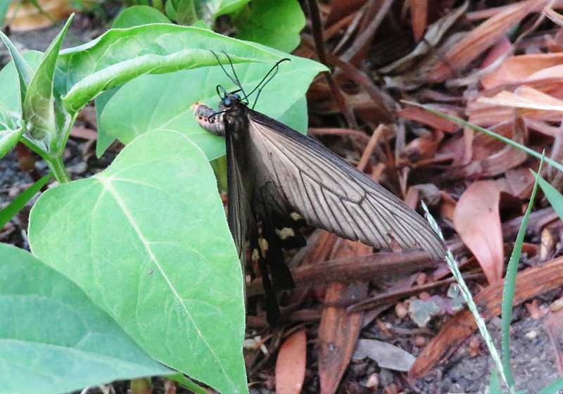 今日の画像は、産卵中のクロアゲハです。一昨日の日曜日、散歩中にクロアゲハのオスが飛び回っていたので追いかけたら、直ぐ近くにメスが葉に止まっているに気が付き、近寄って撮影しました。丁度、腹を持上げて葉に付けていたので、多分産卵の準備中だったのでしょう。クロアゲハのオスは真っ黒ですが、メスは透けるような淡い色です。