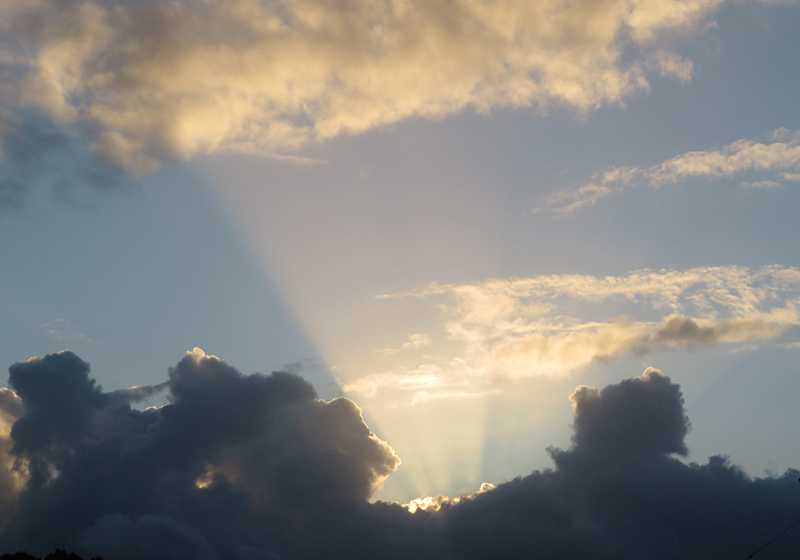 今日の画像は、サーチライト状に広がる今日の朝日です。東の空に広がっていた積乱雲の間から、朝日が空に向かって広がっていました。この時間帯は気温が25度台と過ごし易く、早朝の散歩が楽しめます。