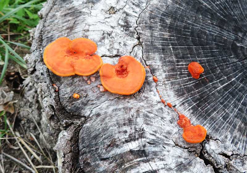 今日の画像は、朱色のキノコです。木の切り株に生えています。これは間違いなく毒キノコでしょうね。