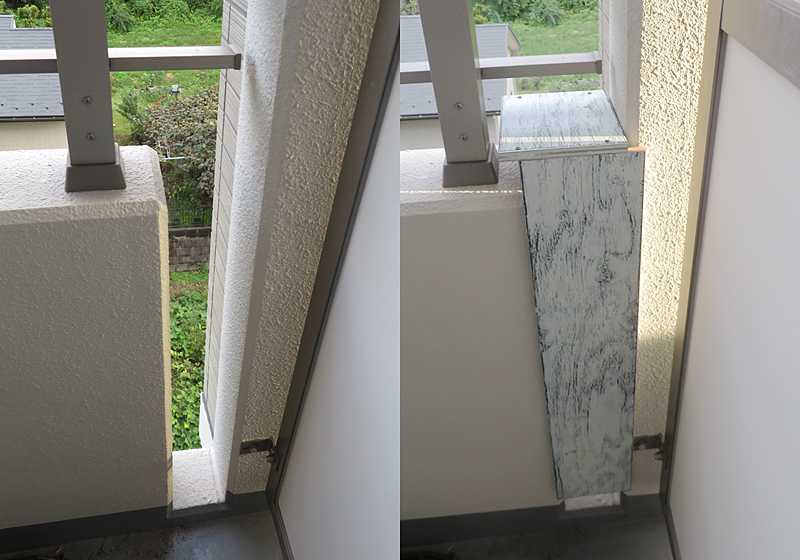 今日の画像は、その手摺壁の状態です。画像の左側が隙間の部分で右側が木材で塞いだ状態です。次女の夫は文系出身で工作道具も持っていないので、工作が得意な私の出番でした。急ごしらえなので、見てくれは我慢我慢、材料費は500円程度でした。