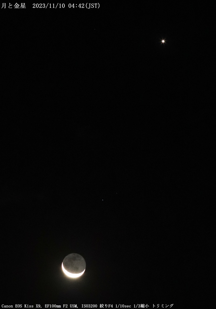 急いでカメラを持って屋上に上がり、急いで撮影しました。肉眼でははっきり見えなかったけど、月の地球照が美しい逆三日月と金星のツーショットが撮影できました。右上の小さな画像は横倒しになっています。