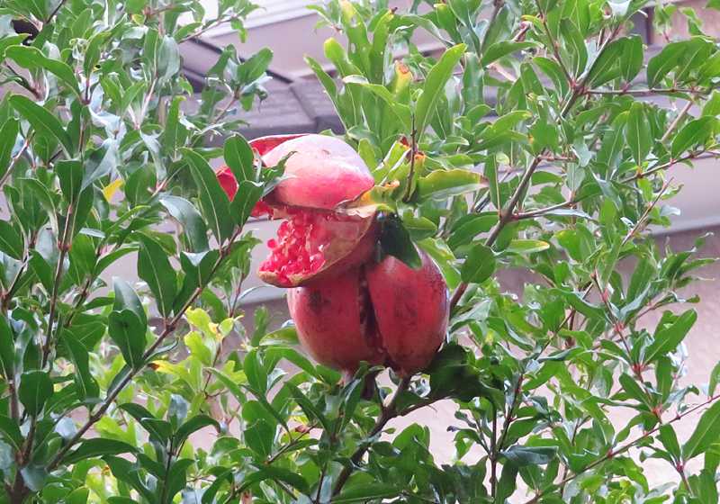 今日の画像は、割れ始めたザクロの実です。ご近所の庭のザクロの実が割れ、中の真っ赤な種が見えています。美味しそうなので食べたいけど、グ〜と我慢です。