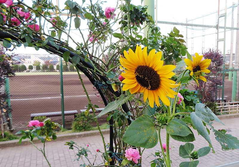 今日の画像は、ヒマワリとバラです。近くの公園の花壇では秋のバラと夏のヒマワリが一緒に咲いています。暖かい天候が続いているので、ヒマワリが復活です。