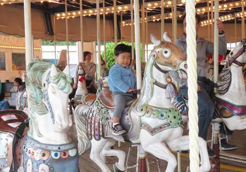 今日の画像は、メリーゴーランドに乗った孫です。今日は天気も今一つ、3連休後の週末なのでシーパラは空いていました。メリーゴーランドに一人で乗り、ご満悦な様子でした。