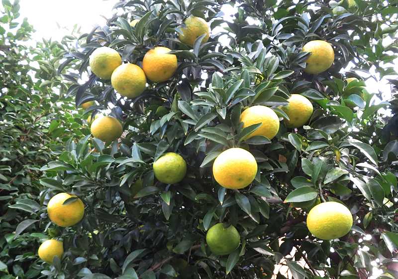 今日の画像は、大きめの柑橘類の実です。町内のお宅の庭にはミカンなどの柑橘類の木が多く植えられており、夏ミカン程度の大きな実が付いている木も多く見られます。そのほとんどは1年中緑色です。この木の実は黄色みが増して来ました。