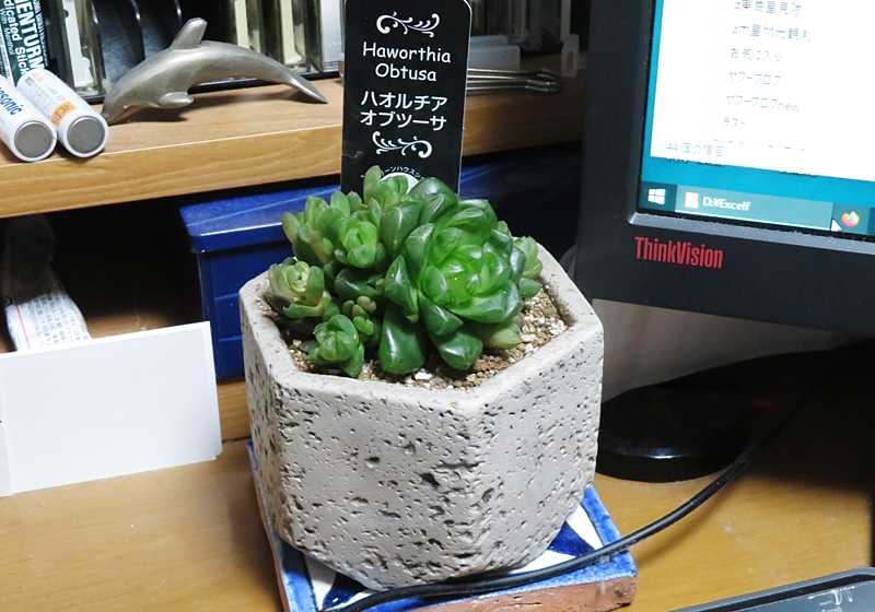 今日の画像は、私の机の上を飾る観葉植物です。何となく自宅の机の上に観葉植物を起きたくなりました。大きなものは邪魔になるので、小さなサボテンを考えていたけど、妻が新たに買ってきた多肉植物が可愛かったの、それを起きました。机の上には緑色の物が無かったので良かった感じです。