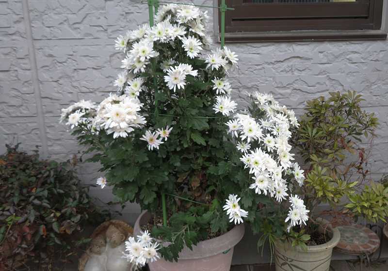 今日の画像は、ご近所の白い菊です。大輪ではないけど、中位の大きさの花です。鉢植えでしっかり咲かせているので、手間をかけて大切に育てているのでしょう。