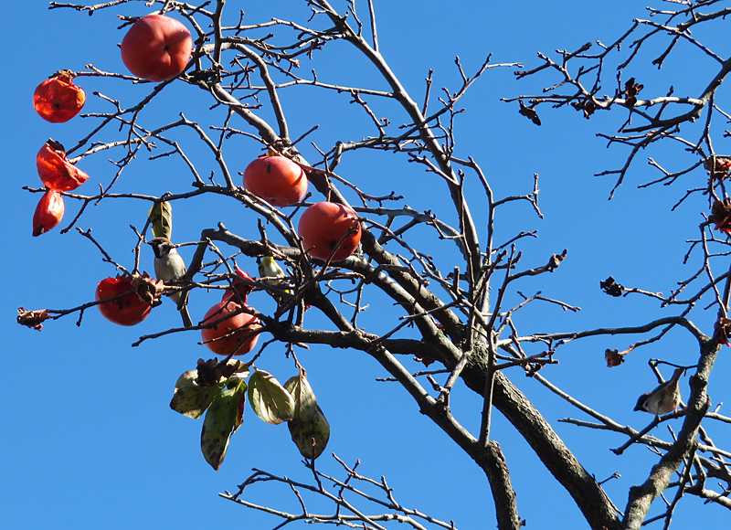 今日の画像は、柿の実に集まるスズメです。先日の日曜日に隣り町を散布していたら、まだ実を付けている柿の木がありました。その柿の木にはヒヨドリやメジロやスズメが10羽以上集まり、柿の実をつついていました。カメラを取り出して向けたら、警戒心が強いヒヨドリとメジロは素早く飛び去り、結局、スズメが3羽しか写っていませんでした。スズメは警戒心が低いです。