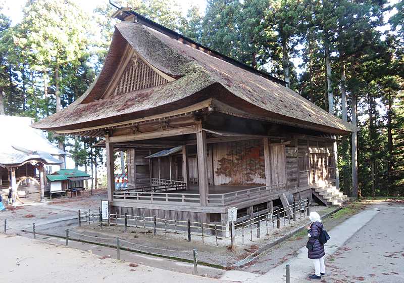 なお、ここでも外人の観光客が目立っていました。金色堂の近くには伊達藩主伊達慶邦公によって建立寄進された国の重要文化財に指定されている白山神社がありました。仏閣の中尊寺を守る神社だそうです。その白山神社の中には能舞台もありました。