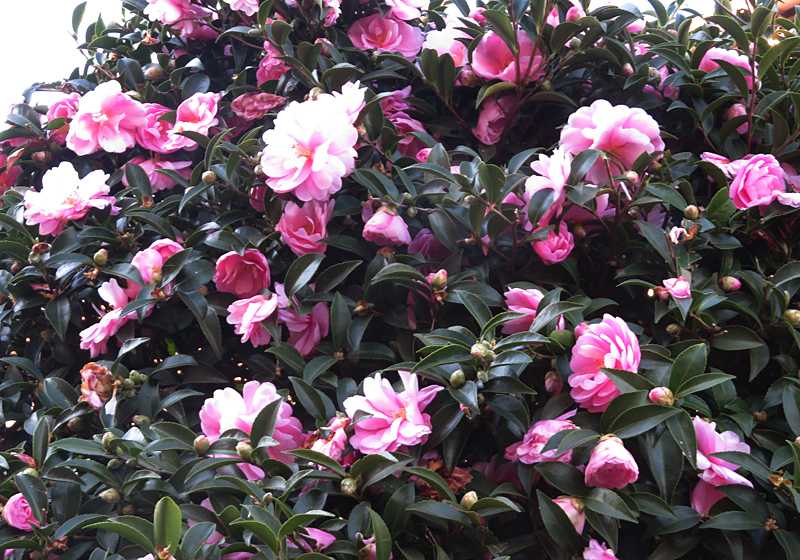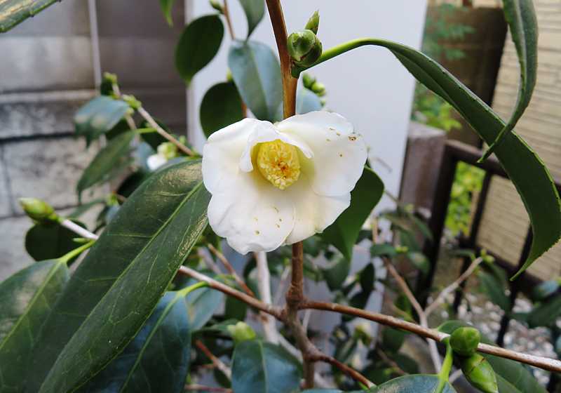 今日の画像は、我が家の侘助です。侘助は椿の一種で白い小振りの花を咲かせます。我が家の侘助は、この時期に咲き始めます。開花したのは一枝に1輪程度で、多くはツボミです。