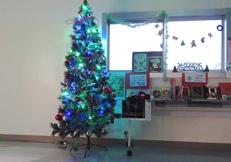 今日の画像は、勤務校のクリスマスツリーです。PTAが準備し、図書室前の廊下に飾られています。日中は外が明るくなるので、日の出前の出勤直後に撮影しました。