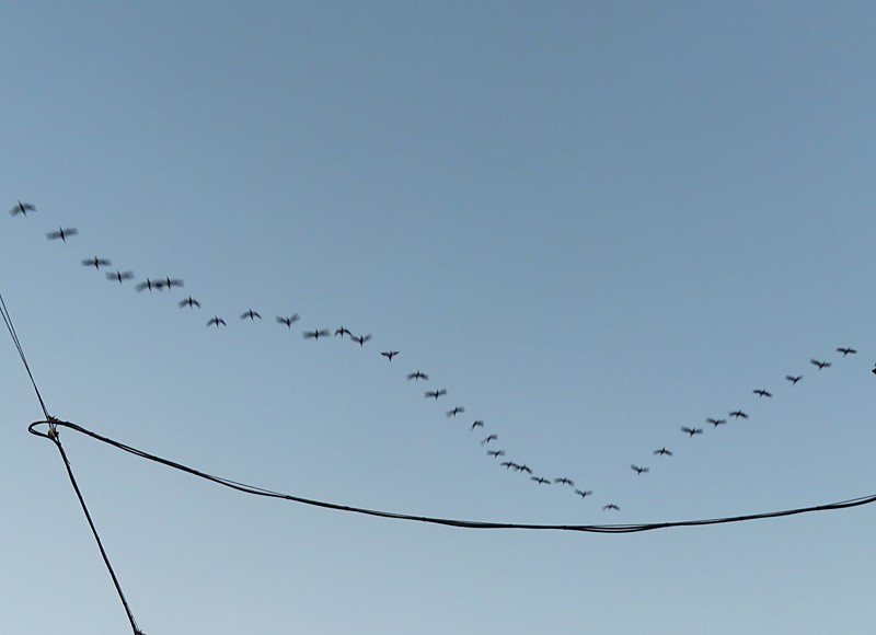 今日の画像は、編隊を組んで飛ぶ鵜です。我が家から歩いて30分ほどの場所にある池に棲んでいる川鵜が、早朝に県内の川に餌を取りに行き、夕方に戻って来ます。その帰路の編隊です。少し暗くなっていたので、露出が長くなり、羽ばたきで羽が二重に写っています。。