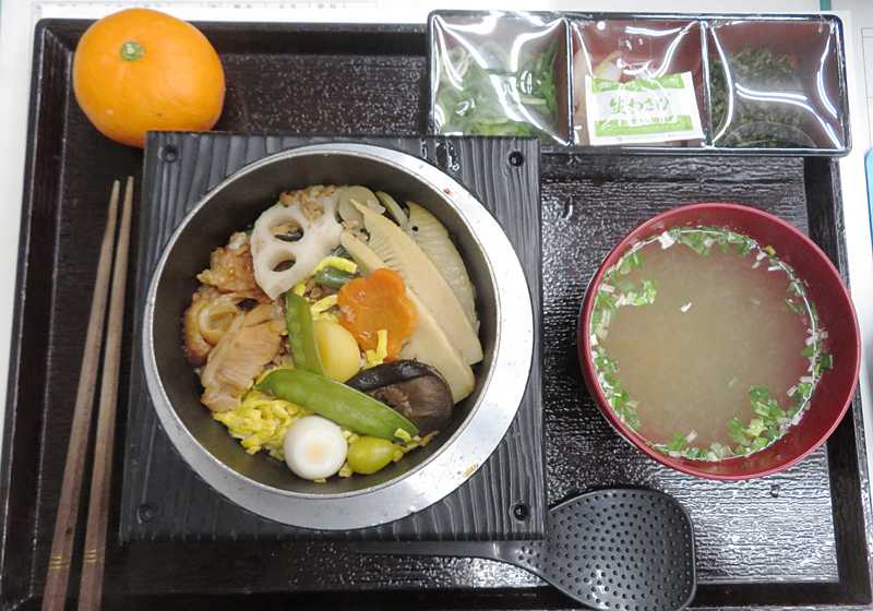 今日の画像は、今日の昼食です。仕事納めの日なので、管理職と事務員だけで、釜飯の仕出しを注文し、校長室の会議テーブルで食べました。インスタントの味噌汁とミカンは自前です。