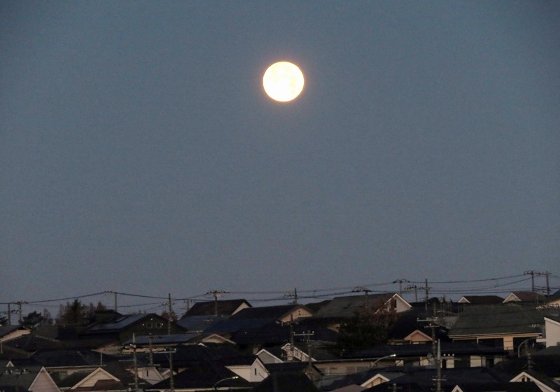 今日の画像は、今朝の満月です。北西の低空で沈む直前でした。朝日が射す前なので前景の住宅がは暗く、明るめに写したので月が露出オーバーでした。