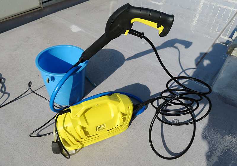 デッキブラシでゴシゴシするより楽ですが、バケツへの補給が大変でした。屋上は5L入りの小型のバケツで12杯、2階の3ヵ所のベランダは計16杯、階段の上り下りに疲れました。外階段と門扉回りは、大型のジェット洗浄機で簡単でした。ベランダの水洗いのついでに窓ガラスと網戸も洗えました。