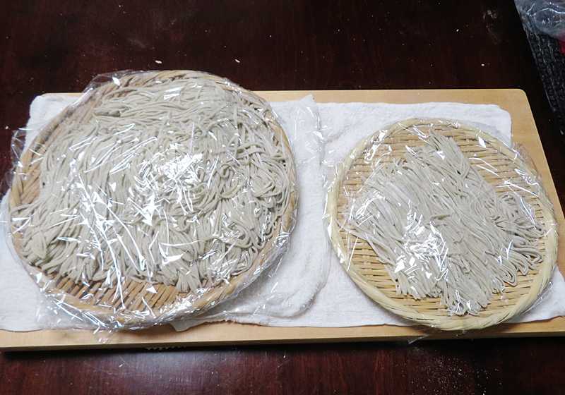今日の画像は、10人分の手打蕎麦です。1時間半程度で打てました。右側が夫婦分で左側が長女一家の分です。今まで苦手だった延ばしもまずまずの出来で、かなり四角く伸ばせました。真ん中の丸いのが延ばす前の2回目分です。