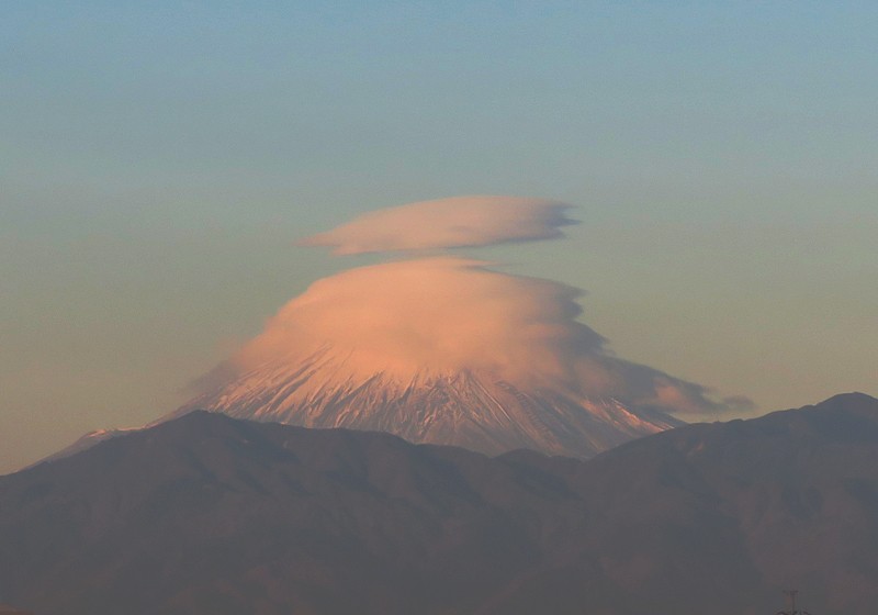 今日の画像は、今朝の富士山です。富士山が幾重もの傘雲の覆われ、まるで白い帽子をかぶった用でした。また、富士山から30度ほど北側にも大きな傘雲の山が見えていました。方角的は定かではないけど、浅間山か八ヶ岳か北アルプスの方向です。傘雲は天気が悪化する前兆。正に今日は曇り空に変わりました。