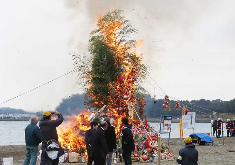 今日は、金沢文庫近くの海の公園で、年始恒例のドンド焼きが行われました。今年で29回目だそうです。小雨決行となっていたけど、念の為電話で開催されることを確認しました。少し早い昼食を食べてから、門松や正月飾りを持って海の公園に向かいました。家を出る時は小雨が降っていたけど、海の公園に着いた時は雨は止んでいました。火入れ開始の13時頃から再び小雨が降り出したけど、傘の必要が無い程度だったので、ドンド焼きは無事に行われました。