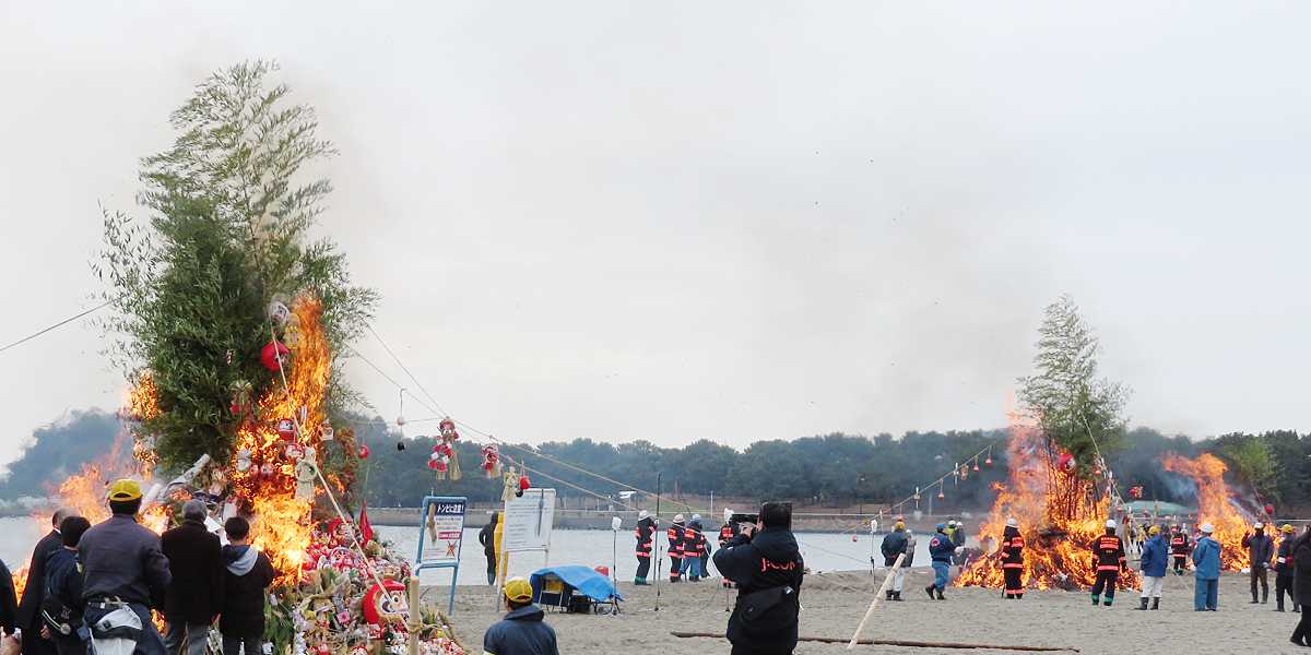 今日の画像は、勢い良く燃え上がるドンド焼きです。風が強めだったので、あっという間に燃え上がった感じでした。ドンド焼きは3山あり、それらの全景の画像はこちらです。