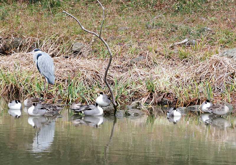 今日の画像は、金沢文庫がある称名寺の池のカモです。昨日行ったドンド焼きの帰りに立ち寄り、境内の池にいたオナガカモを撮影しました。今年は餌を求めて池を進む複数の群れや、岸辺で羽を休める群れなどに別れていました。岸辺で休んでいた群れの近くにはアオサギもいました。