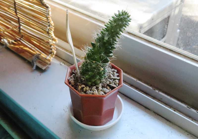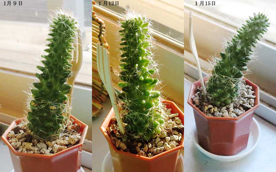 今日の画像は職場のサボテンです。以前勤めていた事務員が残していった小さな鉢植えのサボテンです。半年ほど水もやらず暗がりに放置されていました。昨年末に気が付き面倒を見始めました。南向きに窓際に置いて置いたら、ドンドン傾いていくのです。放置されて根が弱っているのかと思い、傾いている側に小さなフォークを立てて支えにしました。