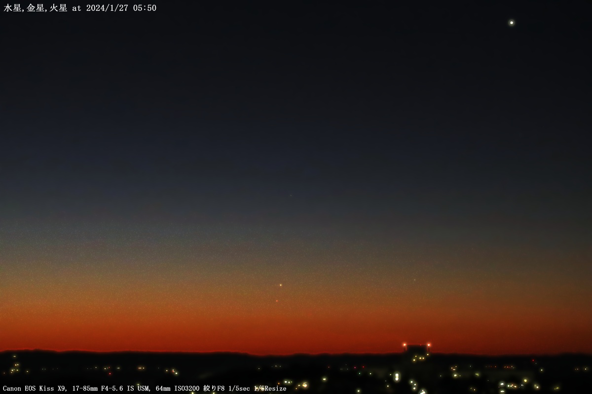 水星の高度は1.9度、火星の高度は1.3度と超低空なので、高度も光度も低い火星は、僅かに早い時間では低空のモヤで、少し遅くなると薄明の明るさで写ら無かったのでしょう。